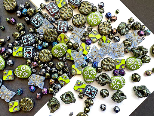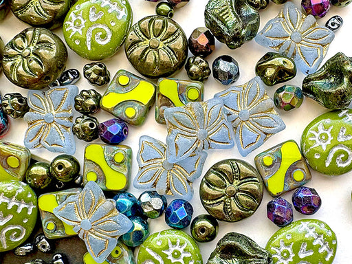 $11.6265 g (2,29 oz) Unique Mix of Czech Glass Beads for Jewelry Making, Beads & Bead assortments. Pressed Beads, Matubo, Rocailles et al. Mixed Shapes and Size, Composition Zanzibar