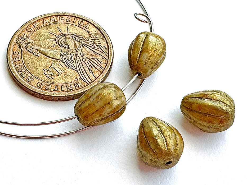 4 pcs Drop Melon Beads 11x9 mm, Alabaster Herbs Spices Curry with Gold Decor, Czech Glass